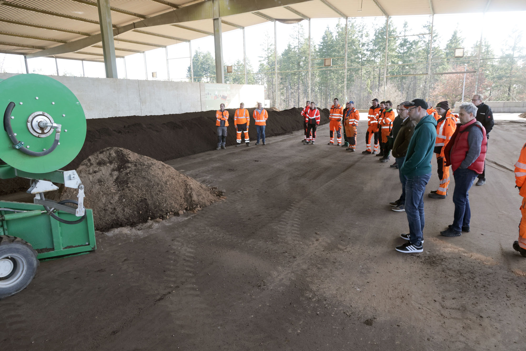 Weiter ging es zur Pyreg-Anlage, mit der aus regionalen Hackschnitzeln hochwertige Pflanzenkohle hergestellt wird. Diese wird sowohl für die Herstellung des Edelsubstrates Terra Preta, als auch zur Beimengung in Tierfutter durch Futtermittelhersteller eingesetzt. Doch auch landwirtschaftliche Betriebe, insbesondere in der Schweiz, setzen diese Kohle als Zusatz zum Stalleinstreu ein, um Gerüche zu minimieren und gleichzeitig den entstehenden Mist noch wertvoller zu machen.Besonders interessant für die Profis aus den Bauhöfen war der Weg des Grüngutes auf der Anlage, technischer Leiter Harald Schäfer, Mitarbeiter Lukas Farrenkopf und Sven Lindner, zuständig für Beprobungen, standen ebenfalls für Fragen zur Verfügung. Von den rund 25 000 Tonnen, die im NOK alljährlich anfallen, werden rund 15 000 Tonnen im Biomassezentrum verarbeitet. Die Maschinenkombination aus Schredder und Sternsieb, Tageskapazität bis zu 800 Tonnen, trennt das Material in Brennmaterial für Großfeuerungsanlagen und Feinmaterial für die Herstellung von Komposten. Letzteres wiederum wird zum Großteil in einem Hygienisierungsprozess zu Frisch- und Fertigkompost für „Acker und Beet“ bzw. zum kleineren Teil in Edelkomposte wie Terra Preta oder Nährhumus weiterverarbeitet.